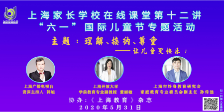 2020年5月31日19点30分,“上海家长学校在线课堂第十二讲”“云开课堂”开课,带来了“六一”国际儿童节专题活动,以“尊重、理解、接纳——让儿童更快乐!”为题,邀请三位嘉宾分享让孩子快乐健康成长的智慧,陪伴孩子从快乐走向幸福。