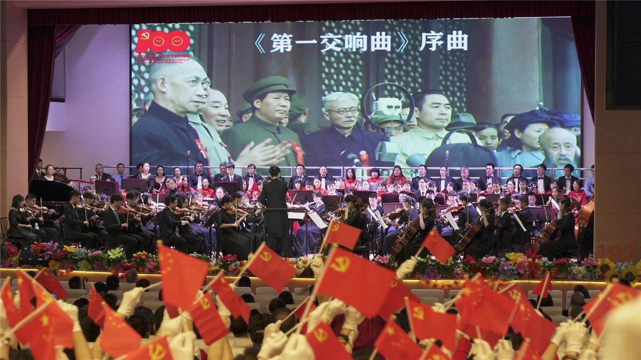 管弦乐《第一交响曲》拉开了本场音乐会的序幕。洋泾社区学校的学员们手持小红旗,用花环、向日葵等道具,跟随着嘹亮的歌声,整齐的做着各式各样的动作、造型,以表达对党对祖国的热爱之情。
