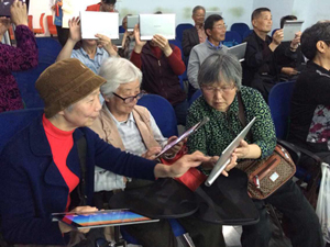 随着社会老龄化的加快,老年人越来越得到社会的关爱和尊重,老年人的晚年生活也日益绚丽多姿。为了有力推进积极老龄化、健康老龄化,南汇新城镇农场居委联合文化中心信息苑,于5月14、15日,开展为期两天的移动互联网培训,18名农场居委居民参加活动。 此次活动分为两个环节:培训+比赛。培训过程中,每位老年人人手一台平板电脑,课程从祖玛、连连看等网络益智游戏入门,教会老年人熟练手指触控指令,进一步学拍照、录像、使用网络、注册和使用微信,让学员了解无线网络的种类与连接,掌握移动终端的基本操作和各种应用。 结束了一天半的培训后,活动进入比赛环节。15日下午,检验学员们的学习成果。对于大多数入门级的老年人而言,接触互联网这么新鲜的事物让他们的生活更多姿多彩,大家都秉持着学习第一、比赛第二的愉悦心情,完成了20分钟的祖玛游戏比赛。最终,农场社区季阿姨以全场过关最多、分数最高拔得头筹。