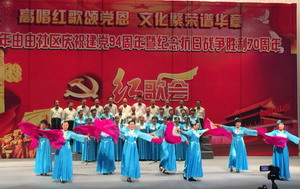 今年是反法西斯和抗战胜利70周年,作为由由分社区的传统,红歌会办的那是格外热闹。2015年6月29日下午,由由八居委合唱队一行38人带着精心准备的合唱节目“弹起我心爱的土琵琶”参加了演出。 演出当天共有21支社区及共建单位合唱队参加,八居委在学习其他单位的精彩演出之余,队员们也暗自较起了劲。待到八居委合唱队登场,三排队员穿着新买的演出服,精神饱满,依次步入舞台中央。音乐响起,队员们都进入了各自的状态。此外,在第二章节中,我们还安排了扇子舞,使得正常演出形式格外丰富。演出结束得到了台下热烈的掌声。 总结本次演出是在去年的基础增加了人员配置、演唱难度,并增加了伴舞。由由八村合唱队将红歌会作为每年重要的回报演出项目,力争唱得一年比一年更精彩。