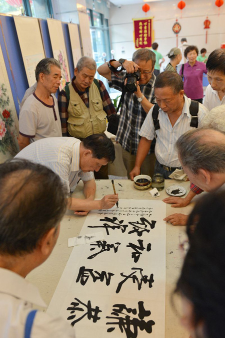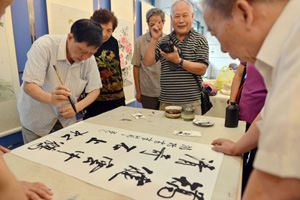 近日,2015潍坊街道全民终身学习活动周开幕式暨“铭记历史翰墨同行”书画展在潍坊社区文化活动中心举行。浦东新区老年书画会会长桑仲元、潍坊社区学校书画社社长杨忠德、各居民区社工以及社区学校、学习站点书画班部分师生等100余人出席活动。 开幕仪式上,杨忠德社长介绍了此次书画展的办展情况。书画社成员们精心准备的一幅幅画作表达了大家期盼祖国繁荣昌盛的美好愿望,希望大家铭记国家如今的和谐局面是当年的战斗英雄用他们的献血和生命换来的。 最后,桑仲元先生讲话,他以本次书画展为切入点,阐述了在当今社会发扬中华民族优秀传统文化的重要性以及各流派书法作品的发扬及传承。