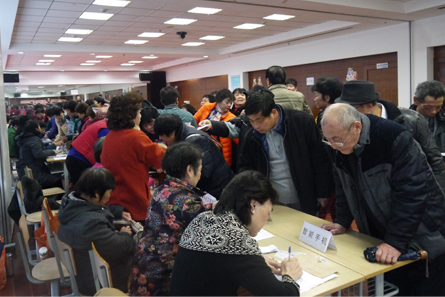 1月5日、6日,是唐镇社区(老年)学校文化休闲类课程2016年春季学期老学员和新学员分别集中招生报名的日子。早上8点钟不到,教室外的走道里前来报名的居民已排成一字长龙。排在最前面的老妈妈早上5点40分就过来排队了
