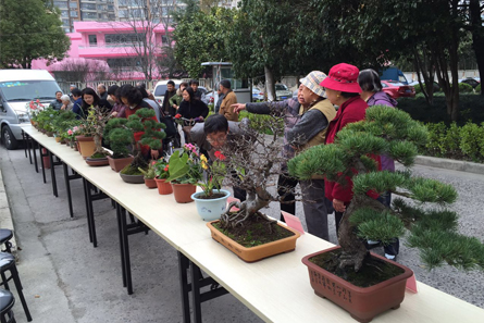 活动当天,现场一改平日的宁静,摇身一变成了热闹非凡的花卉、盆景大观园。娇艳绚烂的海棠、清馨幽雅的兰花、长寿梅、米兰、君子兰、艺术盆景等40多盆造型各异的盆景、花卉,争奇斗艳,现场呈现出一派多姿多彩的喜人景象。而这些全是社区居民们精心种植多年后,从自家搬出来的得意之作。