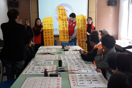 活动伊始,居民区的书法爱好者和上海工商外国语学院法语系的书法爱好者分别自我介绍,相互认识。之后,由上海工商外国语学院的韩晴晴就书法进行了简单的介绍,她从书法的由来、书法的种类及特点、书法的写作方式等几个方面入手,利用PPT的形式深入浅出的介绍了中国书法并详细讲解了写书法时握笔的姿势。韩老师还拿出了自己写的作品,让社区的书法爱好者慢慢临摹,并给予适当的指导。