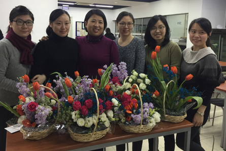 本次活动由育畅高级花艺师朱老师主讲,活动伊始,朱老师运用PPT和示范实物把插花六法,即“高低错乱、疏密有致、虚实结合、上轻下垂、上散下聚、仰卧呼应”简洁明了、生动形象的讲解,使大家在最短的时间内掌握欧式插花的技巧并运用到实操中。在DIY 环节,大家纷纷“大开脑洞”,在老师和助教的指导下,修剪花枝,整理花朵,扦插位置……。玫瑰花、郁金香、紫罗兰、蕾丝……这些花枝经过大家1个小时巧手的创意、组合,70多件插花作品孕育而生,这些艺术品或热情欢乐、或典雅秀丽、或雍容华贵、有的作品展示出对生活的热爱,有的作品从中银服务出发体现对工作内涵的领悟。