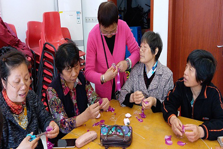 “丝袜花是一种艺术… …”。活动中,志愿者老师向编织屋成员们示范了桃花丝袜花制作的要领,手把手的教授,缠丝网、绑花瓣、花蕊、做叶子…,详细讲解了丝袜花的制作过程,编织屋成员们每一步骤都学的特别认真。成员们小心翼翼地拿着手中五颜六色的丝袜花材料,在志愿者老师认真细致的指导下,不一会儿,一朵朵色彩鲜艳、栩栩如生的桃花就在大家的巧手中诞生了。她们拿着自己制作的作品,相互比较、交流经验,脸上满是喜悦和成就感。在活动过程中,志愿者老师除了教授制作丝袜花,还不时地与大家闲谈生活,畅谈人生,增进了彼此之间的了解。