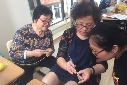 当天下午,来自不同地方的中老年人20余名济济一堂。她们有的来自上海市老年大学、有的来自南码头社区,有的是未来教育培训中心的退休教师,有的则是学员家长。虽然走进教室的那一刻,彼此之间还都是陌生人,但共同的兴趣爱好很快就将活动的氛围推向了高潮。根据编织和钩织的内容不同,大家陆续分成了4、5个小组,开始分头探讨和切磋。一些从来没有接触过编织和钩织的老年人在主办方安排的老师们手把手教学的过程中很快掌握了基本的技巧,并取得了初步成效,结出了小小的成品。而一些有编织经验的中年人则三五成群地热烈讨论和实践着各种花色的具体编织,教室里不时响起欢声笑语……不知不觉中两个小时的活动进入了尾声,在场的每个人脸上都浮现出意犹未尽的表情,在一阵依依不舍的惜别声中活动圆满落幕了。