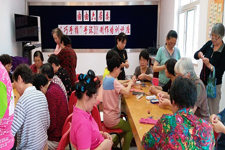 编织高手张美琴阿姨为大家详细讲解了手工编织的基本材料、编织方法和技巧,同时还通过现场亲自编织一对一地给阿姨们进行讲解。社区阿姨们听得认真,掌握地很快,相互间还探讨研究。在志愿者老师的帮助下,阿姨们用灵巧的双手编织出了一串串美丽的手环。阿姨们拿着亲手编出的幸福手环,迫不及待将作品戴在手上,自豪的向周围人展示。现场的气氛热闹极了,充满了一种创造的乐趣。