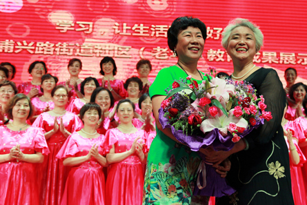 在表彰会上,14个居民区示范学习点,24名社区终身教育“优秀园丁”,第2届全国社区教育优秀微课程优秀获得者吴根华,受到街道领导颁发的铭牌、奖杯,学员代表把最美的鲜花,观众把最热烈掌声献给了辛勤的优秀园丁。街道领导还欣赏观看了学员们精彩的文艺表演,展示了学员们学习让生活更美好的风采。还饶有兴趣地参观了社区(老年)教育成果展览,当看到学员们手工艺,书法作品展,为学员们15年来学习成果点赞,终身学习使精神为至,老有所学,老有所用,老有所乐,老有所为,为构建“大爱浦兴,美好家园”起到了积极推动作用。当“优秀园丁”于健老师和学员看到展板上学习照片时,于健老师深有感触地说:“虽然,我已是中老年教师,我要把自己才艺毫不保留地 传教给学员们,让他们从家庭买汰烧、搓麻将中走出来,学钢琴、学唱歌,丰富业余文化生活,成为社区一名好歌手、好钢琴师,这就是我最大的心愿!”