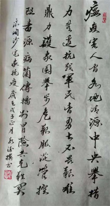 成都市龙江路小学中粮祥云分校毛若水 新都区 宅家不停学,携手战“疫”,共克时艰!新都区市民自主学习团队积极响应上级教育部门的号召,在做好相关防护工作的同时,加强现代教育技术手段在学习中的应用,充分利用区域终身学习平台、微信群、QQ群、微博等,开展丰富多彩的线上学习活动。 书法《浪淘沙·宅家抗疫》