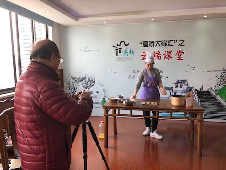 “叮咚”,手机里传来一条微信信息,这是龙身蛇形太极拳区级传承人徐冠楠的一条小视频。这是“高桥大家汇”云端课程项目的第一条初稿,时间定格在3月3日上午10点15分。 就在这天上午九点半,高桥镇文化服务中心、高桥镇社区学校、高桥镇图书馆联合启动“高桥大家汇”云端课程项目,接到拍摄任务的徐老师立刻支起手机,自拍了这条视频,前后不到1小时。 云端课堂,是课程与网络的结合,为保证课程能尽快上线,一切工作都在争分夺秒,问题也迎面而来。拍什么?谁来拍?怎么拍?...... 2小时确定拍摄方案。疫情期间为减少聚集,究竟是居家拍摄还是统一拍摄产生了些纠结,但为了较好的视觉效果,我们决定在有控制的前提下,统一拍摄,摄影班的陈国鑫老师主动请缨,承担拍摄和后期制作任务。 4小时确定师资。学校在志愿者老师中宣传发动,得到所有老师的大力支持,首批龙身蛇形太极拳等4门课程老师入选参加拍摄。 2天完成摄影棚搭设。主背景经过反复的推敲和修改,与3月5日安装到位,配以讲台、电脑、简单的灯光和录音设备,一个简易的摄影棚完工。 第3天,完成教案和拍摄脚本审核,排定拍摄顺序。 第4天,第一堂课程《家庭点心制作》开机。 第6天,第一课完成视频剪辑和配音。 一个星期,4门课程,22节微课全部拍摄完成。