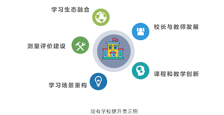 5种建设模式,满足多样化需求 未来的学校将成为教育创新中心,学校的定位、学校的组织体系、学校的管理架构、学校的激励机制都要进行相应的变革。“未来路线图”实验学校在落地应用中,按照对象不同分为五种建设模式分别为: