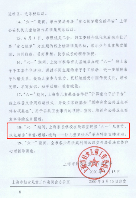 特别荣幸的是:本次直播活动由上海市教委德育处指导,《上海教育》杂志协办。2020年5月15日,上海市妇女儿童工作委员会公布了“本市庆祝2020年‘六一’国际儿童节主题活动名册”,本次专题直播活动名列其中。