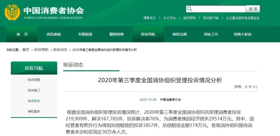 报告显示,2020年第三季度全国消协组织共受理消费者投诉219909件,解决167785件,投诉解决率76%,为消费者挽回经济损失29514万元。