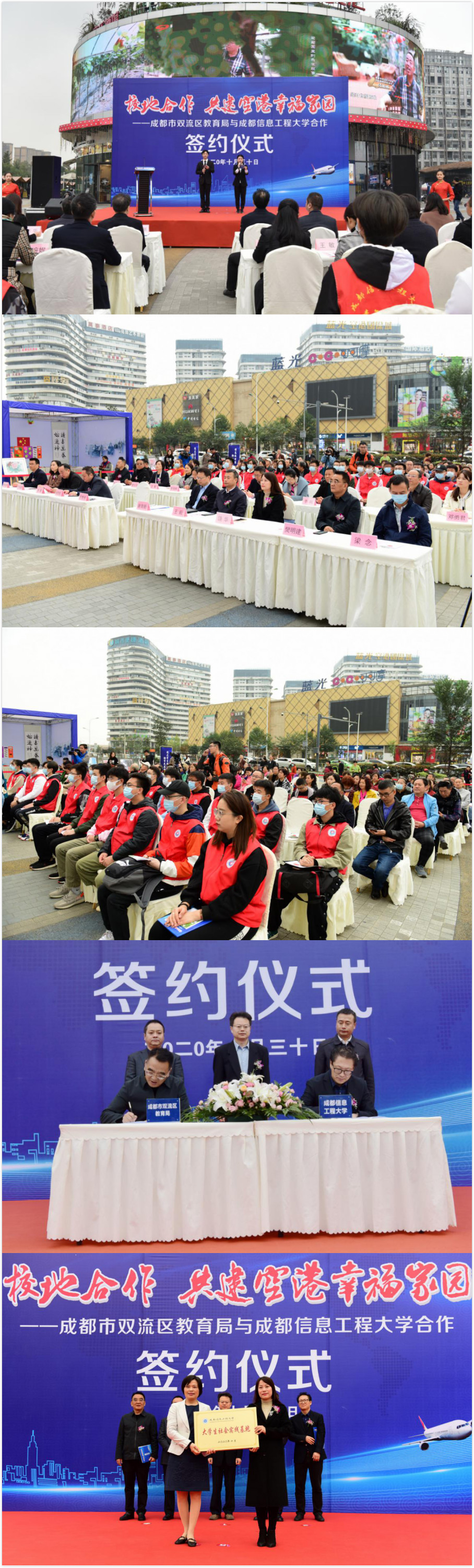 根据《教育部等九部门关于进一步推进社区教育发展的意见》和《教育部等七部门关于推进学习型城市建设的意见》相关文件精神,为进一步落实《成都市社区教育促进条例》,提升双流社区教育品质,同时也为高校师生广泛参与社会实践,服务广大社区居民,促进高校与基层社区教育互动合作,10月30日上午,成都市双流区教育局与成都信息工程大学校地合作签约仪式在双流区西航港街道蓝光空港国际城广场举行。成都广播电视大学(成都社区大学)党委副书记、校长谢育新,成都信息工程大学党委常委、副校长于世祥,双流区委常委、组织部部长、社治委主任王毅,双流区西航港街道党工委书记胡劲松,双流区委教育工委书记、区教育局党组书记、局长樊明建等领导出席了签约仪式,成都信息工程大学团委、教务处、学生处,双流区教育局相关职能科室、双流区社区教育学院、部分社区教育学校及工作站负责人、学生志愿者、市民代表共130余人参加。