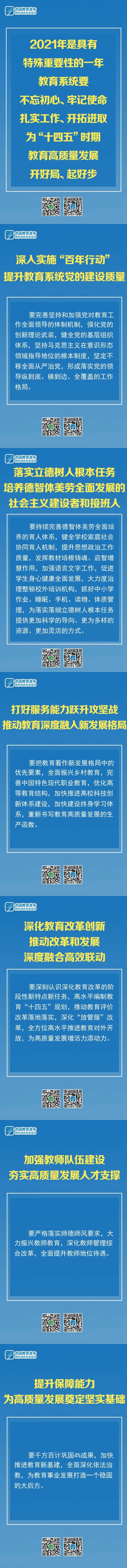 1月7日至8日,2021年全国教育工作会议在京召开。教育部党组书记、部长陈宝生作工作报告。会议都强调了哪些内容? 1月7日至8日,2021年全国教育工作会议在京召开。会议强调,要以习近平新时代中国特色社会主义思想为指导,贯彻落实党的十九大和十九届二中、三中、四中、五中全会精神,贯彻落实习近平总书记关于教育的重要论述和全国教育大会精神,按照“五位一体”总体布局和“四个全面”战略布局,增强“四个意识”、坚定“四个自信”、做到“两个维护”,坚持稳中求进工作总基调,立足新发展阶段,贯彻新发展理念,构建新发展格局,以推动高质量发展为主题,以改革创新为根本动力,坚持系统观念,更好统筹发展与安全,坚持和加强党对教育工作的全面领导,全面贯彻党的教育方针,落实立德树人根本任务,坚持发展抓公平、改革抓体制、安全抓责任、整体抓质量、保证抓党建,全面推进依法治教,巩固拓展疫情防控和教育改革发展成果,为建设高质量教育体系立柱架梁,推进教育治理体系和治理能力现代化,为建设教育强国开好局、起好步,以优异成绩庆祝建党100周年。教育部党组书记、部长陈宝生作工作报告。 2020年,教育系统扛过了大疫大考,经受了大风大浪,为党和国家工作大局作出了重要贡献 会议指出,刚刚过去的2020年,是极不平凡的一年,给教育系统带来了一场大考、连环考、压茬考。教育系统坚持以习近平新时代中国特色社会主义思想为指导,在党中央、国务院坚强领导下,迎难而上、砥砺奋进,统筹疫情防控和教育改革发展,推进教育“十三五”规划圆满收官,疫情防控取得重大战果,教育脱贫攻坚取得重大胜利,全面落实立德树人根本任务取得重大进展,教育改革开放实现重大突破,扛过了大疫大考,经受了大风大浪,为党和国家工作大局作出了重要贡献,进一步增强了教育自信,推动中国教育站在了新的历史起点上。 深入学习贯彻五中全会精神,强化使命意识、宗旨意识、协同意识、担当意识、风险意识 会议强调,“十四五”时期,我国教育进入高质量发展阶段,教育改革发展的外部环境和宏观政策环境已发生深刻变化,面临着新形势、新阶段、新理念、新格局、新目标、新要求。教育系统要在认识上找差距,在工作上找短板,在措施上找弱项,在落实上找问题,在安全上找盲点,坚持问题导向、目标导向、结果导向,深入学习贯彻五中全会精神,切实抓好工作落实。 一是认真学习深刻把握党的十九届五中全会精神,强化使命意识。要把握大势、胸怀大局、结合实际,深刻认识全面建设社会主义现代化国家的历史必然性,自觉服从服务于构建新发展格局,不断提高政治判断力、政治领悟力、政治执行力。 二是坚持人民至上的价值取向,强化宗旨意识。要从全体人民的根本利益出发,自觉站在人民立场上想问题、作决策,推动解决群众“急难愁盼”突出问题。 三是推进改革成果系统集成,强化协同意识。要善于从整体上看待和理解问题,善于从系统的观点和结构的角度去解决问题,以更宽广的视野来深化协同。 四是切实推动实际问题解决,强化担当意识。要把发现问题、解决问题作为打开工作局面的突破口,打破思维定势和工作套路,找到真正的问题,创造性应对问题。 五是牢牢守住安全发展这条底线,强化风险意识。要绷紧安全发展这根弦,树立底线思维,掌握战略主动,提高应急处突能力,筑牢防范化解各类风险的“铜墙铁壁”。 2021年是具有特殊重要性的一年,教育系统要为“十四五”时期教育高质量发展开好局、起好步 会议指出,2021年是具有特殊重要性的一年,教育系统要不忘初心、牢记使命,扎实工作、开拓进取,为“十四五”时期教育高质量发展开好局、起好步。 一是深入实施“百年行动”,提升教育系统党的建设质量。要完善坚持和加强党对教育工作全面领导的体制机制,强化党的创新理论武装,健全党的基层组织体系,坚持马克思主义在意识形态领域指导地位的根本制度,坚定不移全面从严治党,形成落实党的领导纵到底、横到边、全覆盖的工作格局。 二是落实立德树人根本任务,培养德智体美劳全面发展的社会主义建设者和接班人。要持续完善德智体美劳全面培养的育人体系,健全学校家庭社会协同育人机制,提升思想政治工作质量,发挥教材培根铸魂、启智增慧作用,加强语言文字工作,促进学生身心健康全面发展,大力度治理整顿校外培训机构,抓好中小学作业、睡眠、手机、读物、体质管理,为落实落细立德树人根本任务提供更加科学的导向、更为多样的资源、更加灵活的方式。 三是打好服务能力跃升攻坚战,推动教育深度融入新发展格局。要把教育看作新发展格局中的优先要素,全面振兴乡村教育,完善中国特色现代职业教育,优化高等教育结构,加快推进高校科技创新体系建设,加快建设终身学习体系,重新书写教育高质量发展的生产函数。 四是深化教育改革创新,推动改革和发展深度融合高效联动。要深刻认识深化教育改革的阶段性新特点新任务,高水平编制教育“十四五”规划,推动教育评价改革落地落实,深化“放管服”改革,全方位高水平推进教育对外开放,为高质量发展增活力添动力。 五是加强教师队伍建设,夯实高质量发展人才支撑。要严格落实师德师风要求,大力振兴教师教育,深化教师管理综合改革,全面提升教师地位