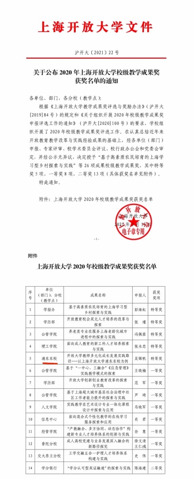近日,上海开放大学系统2020年教学成果奖评选结果揭晓,上海开放大学浦东东校吴锦帆校长代表学校提交的教学成果“开放大学教师多元化成长发展实践路径---以上海开放大学浦东东校为例”荣获了特等奖。在本次教学成果奖的评选中,上海开放大学共评出26项教学成果奖,其中特等奖5项,一等奖8项,二等奖13项,浦东东校是唯一一所荣获特等奖的开大系统分校,同时也是学校近五年在上海开大系统获得的最高殊荣。 浦东东校的教学成果“开放大学教师多元化成长发展实践路径---以上海开放大学浦东东校为例”主要探讨了在上海开放大学业务指导下,学校以开放教育事业转型发展为契机,结合教师个人需求,坚持不懈地探索教师多元化成长发展的实践路径。 本次获奖是对于浦东东校师资队伍建设工作的肯定,体现了浦东东校经验的可借鉴性和可推广性。下一步,浦东东校将继续为上海开放大学的人才培养目标提供优质的师资储备,深入推进开放教育事业的转型发展。 (开放大学浦东东校 张佳昊 供稿 选编:问心) |