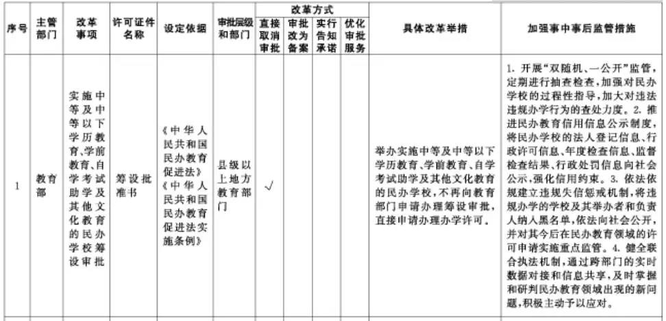 在《中央层面设定的涉企经营许可事项改革清单(2021年自由贸易试验区版)》中,国务院明确以下事项的改革方式为直接取消审批:实施中等及中等以下学历教育、学前教育、自学考试助学及其他文化教育的民办学校筹设审批。