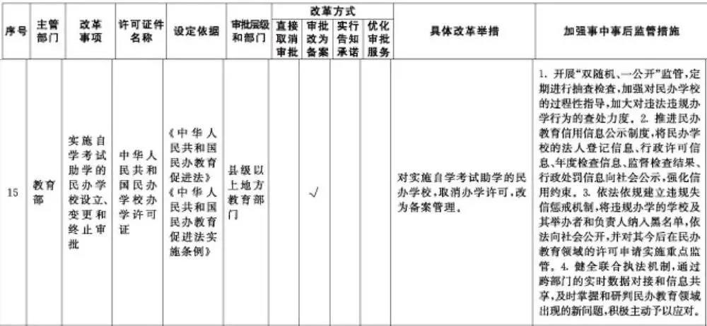 具体改革举措为:对实施自学考试助学的民办学校,取消办学许可,改为备案管理。