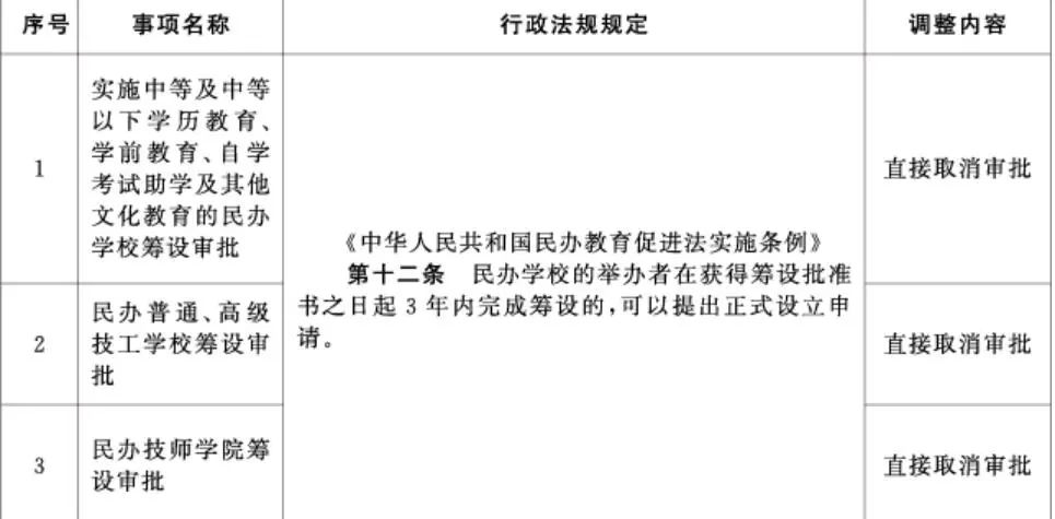 在《国务院决定在自由贸易试验区暂时调整适用行政法规有关规定目录》中,国务院明确以下3个事项的调整内容为直接取消审批:(1)实施中等及中等以下学历教育、学前教育、自学考试助学及其他文化教育的民办学校筹设审批;(2)民办普通、高级技工学校筹设审批;(3)民办技师学院筹设审批。