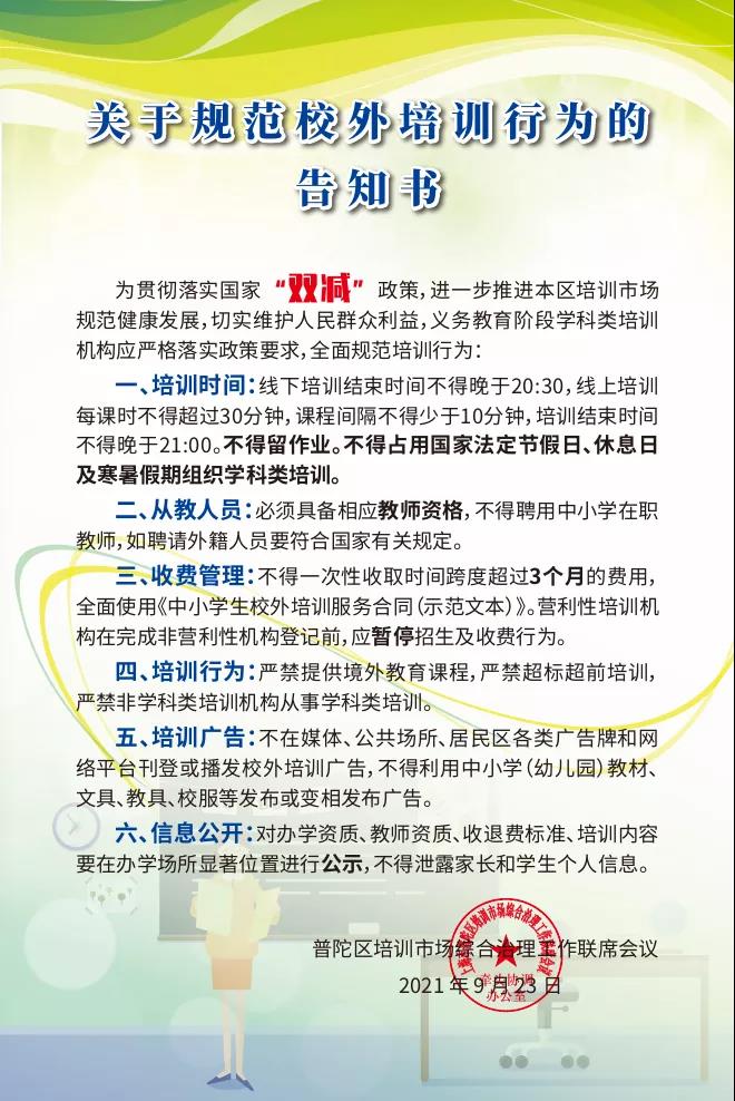 为持续做好校外培训机构专项治理工作,进一步贯彻落实中央和市委、市政府关于校外培训“双减”工作的精神和要求,普陀区依托区培训市场综合治理工作联席会议机制,充分发挥十个街镇“双减”工作专班力量,在国庆节期间开展联合检查,重点规范义务教育阶段学科类培训行为,确保本区校外培训市场平稳有序。 节前,普陀区召开落实“双减”要求,推进培训市场综合治理工作例会,研究部署国庆期间联合检查工作,要求进一步加大巡查力度。同时,区培联办发布《关于规范校外培训行为的告知书》,并向全区校外培训机下发“不得占用国庆节假日开展学科培训”警示要求。