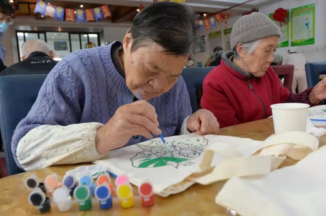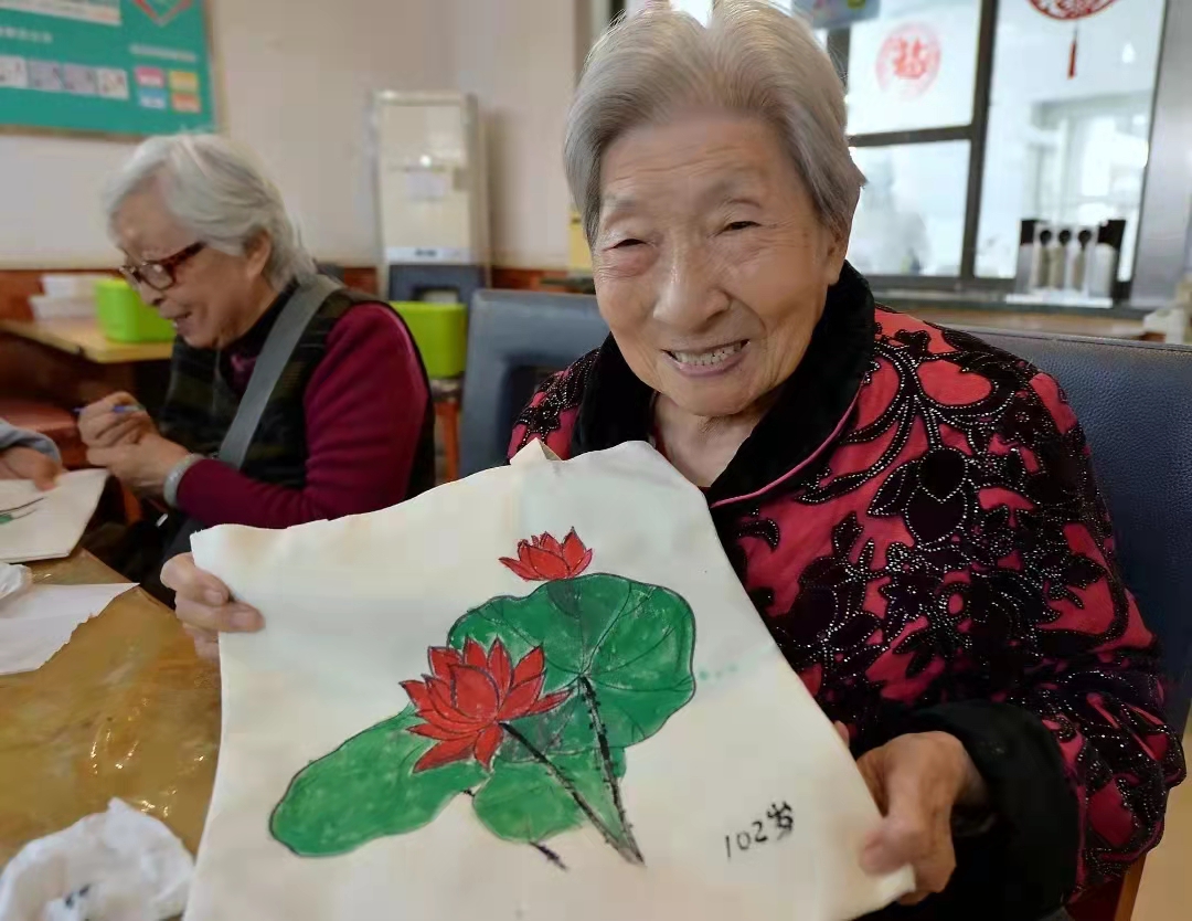 本次活动是组织30多位平均年龄为88、89岁的老人们手绘帆布包,其中一位93岁老人说:她没有读过书,不认字,但是她在老师的指导下,也一笔一划有模有样。还有一位102岁老人,恬静地坐在那里,也自己动手画的特别认真,让人佩服。