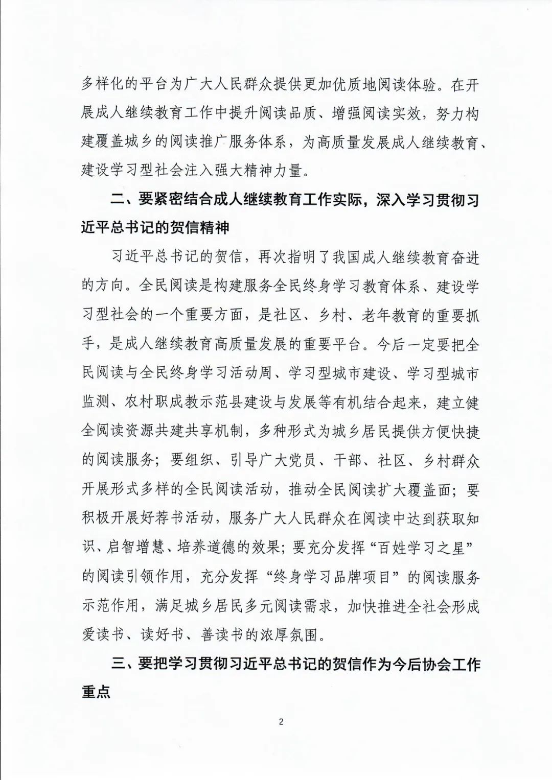 4月23日,首届全民阅读大会在京开幕。习近平总书记发来贺信,希望广大党员、干部带头读书学习,修身养志,增长才干;希望孩子们养成阅读习惯,快乐阅读,健康成长;希望全社会都参与到阅读中来,形成爱读书、读好书、善读书的浓厚氛围。中国成人教育协会近日发出《关于学习贯彻“习近平总书记致首届全民阅读举办的贺信”的通知》,要求紧密结合成人继续教育工作实际,深入学习贯彻习近平总书记的贺信精神,把学习贯彻习近平总书记的贺信作为今后协会工作重点。