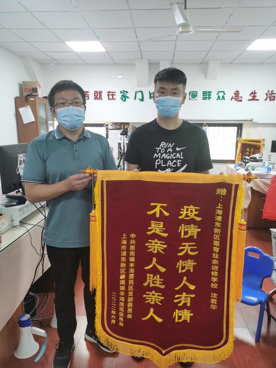 日前,惠南镇丰海居委龚书记为上海浦东新区惠育业余进修学校的沈君华老师送上锦旗,向其在疫情期间的善举表示感谢。“疫情无情人有情,不是亲人胜亲人”锦旗上的几个耀眼烫金字又让人回想起疫情封控时的那些感动时刻。