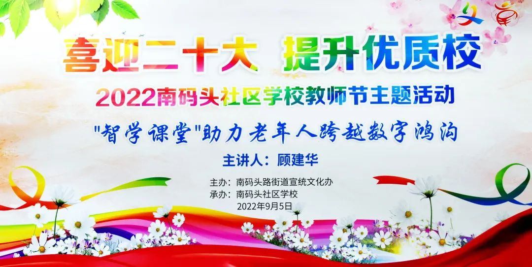 为迎接党的二十大,展现广大教师爱党爱国、立德树人、自信自强的精神风貌,常态化推进师德师风涵养教育,不断提升优质校的各项工作,在我国第38个教师节,也是党的十八大以来第10个教师节来临之际,南码头社区学校举办了“喜迎二十大·提升优质校”教师节主题活动。 专题讲座 活动特邀洋泾社区学校顾建华校长作精彩专题讲座,重点介绍“智学课堂”网上助学大平台、线下助学大课堂、家门口助学延伸大辐射“三位一体”的教学实践活动。为我们切实帮助老年人适应数字化时代生活,跨越数字鸿沟,开启智能手机应用的“破冰之旅”,传授了很好的经验和做法,受益匪浅。