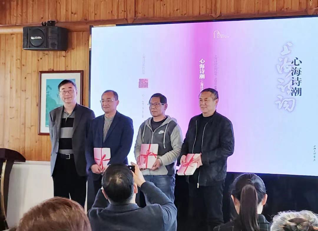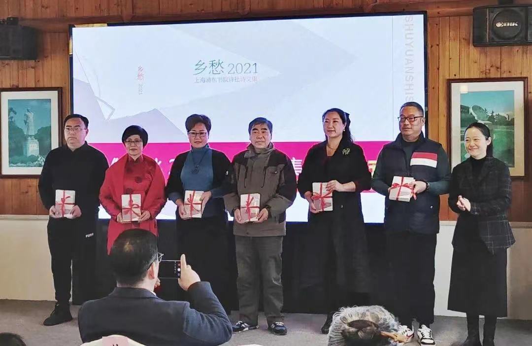 “关注书院,品鉴书香”。 “春和景明,万象更新”。 近日,天朗气清,春风和煦。群贤毕至,少长咸集。书院诗社第6期诗歌沙龙暨乡愁系列诗集首发式在“书院人家·贤士苑”隆重举行,赢得了四面八方诗友们的热情参与。 为学习贯彻党的二十大精神,纪念毛泽东在延安文艺座谈会上的讲话发表81周年,书院诗社举办了这场以“文艺·生活·人民”为主题诗歌沙龙胡晓军专场暨《乡愁2021》诗集首发式。本次活动,由上海市民诗歌节组委会办公室指导,书院诗社主办,书院人家协办,书院诗社和闵行诗社、顾村诗社、共富诗廊社、上海诗剧社、上海知青诗社,以及ACC上海惠风文学社、新金桥诗社、漕河泾诗社等9家诗社的共计60余人参加了活动。 活动共分两大版块 第一版块有三个仪式 第二版块是诗歌沙龙 壹 第一版块·三个仪式 颁奖仪式 上海市民诗歌节组委会办公室主任徐建华先生,向书院诗社副社长施国标颁发“2022年第8届上海市民诗歌节优秀组织奖”奖牌和证书。 赠书仪式 上海诗词学会会长、《上海诗词》主编胡晓军先生,为书院诗社作者代表赠送《上海诗词·心海诗潮》新诗集。 诗集首发 书院诗社第五部诗文集《乡愁2021》首发。书院镇人民政府副镇长汪慧婷女士,为书院诗社社员代表、诗集作者代表和兄弟社诗友代表授书。 贰 第二板块·诗歌沙龙 文艺·生活·人民 ——我的诗词观和创作谈 主讲嘉宾胡晓军老师,是上海诗词学会会长,《上海诗词》主编,上海市文联理论研究室主任,上海市文艺评论家协会副主席,中国剧协、上海作协会员,也是书院诗社特聘指导老师。