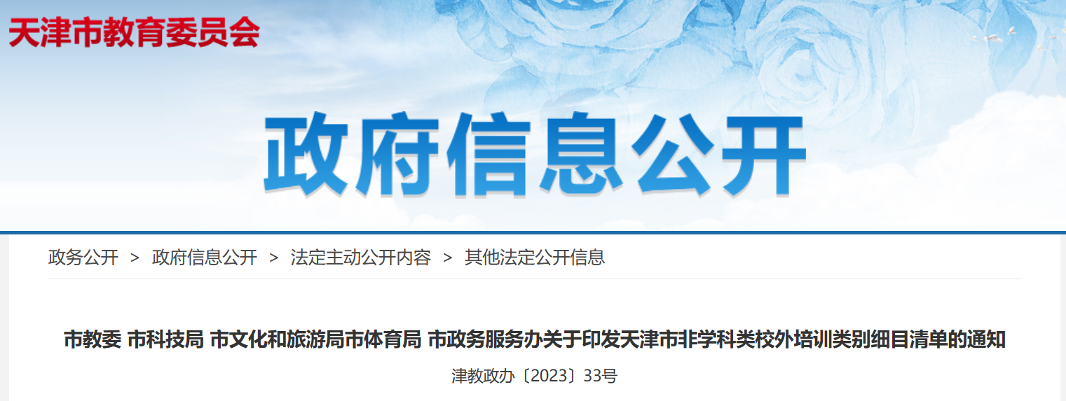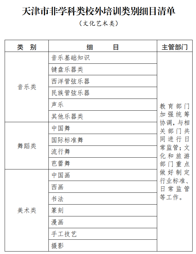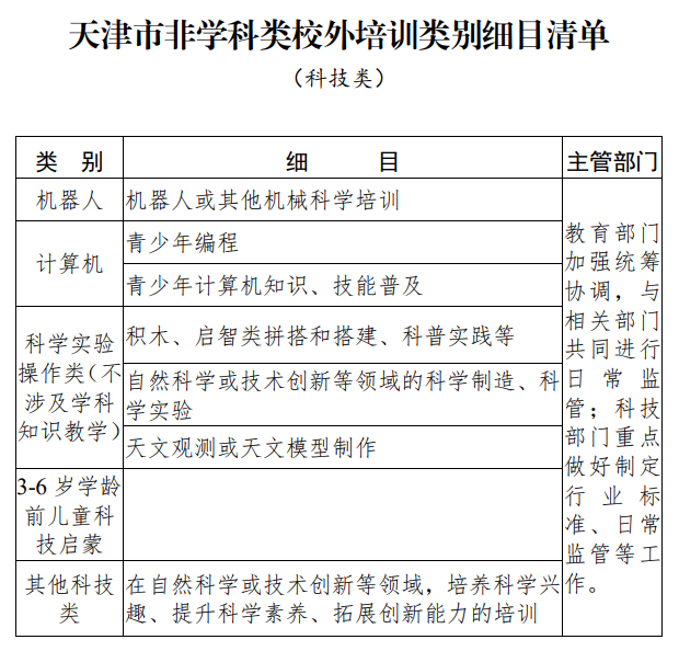 为进一步深化校外培训机构治理,全面规范非学科类校外培训行为,切实维护广大中小学生和学生家长权益,按照《教育部等十三部门关于规范面向中小学生的非学科类校外培训的意见》和《市教委等十四部门关于印发天津市规范面向中小学生的非学科类校外培训的实施方案的通知》,市教委、市科技局、市文化和旅游局、市体育局、市政务服务办等五部门联合制定了《天津市非学科类校外培训类别细目清单》。现予印发,请结合实际,在非学科类校外培训机构审批、监管过程中抓好贯彻落实。 非学科类校外培训类别细目清单根据新出现的培训类型实行动态调整。