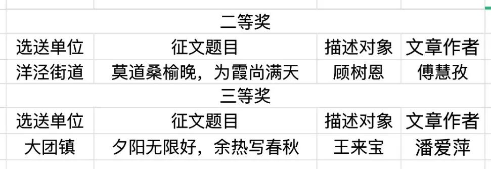 经过区级评选,共有22篇征文入围区级奖项;获得区级一等奖的两篇征文经市专家组复选和终评,分别荣获市级二等奖和三等奖,现将获奖名单公布如下: