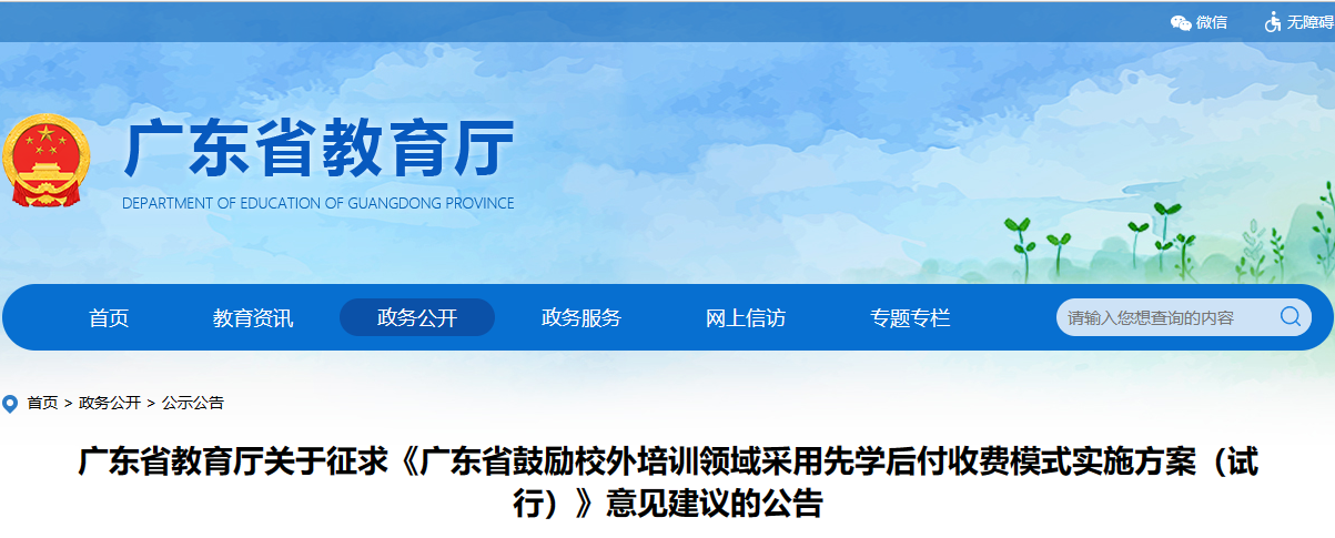 | 广东省教育厅关于征求《广东省鼓励校外培训领域采用先学后付收费模式实施方案(试行)》意见建议的公告 |
