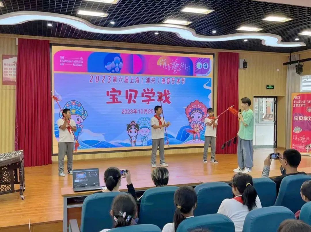 时至中午,演员们走进校园,分别为浦兴中学、东荷小学、东蕾幼儿园的大小朋友送上餐后“艺术”甜点。在东荷小学,以戏曲“服化道”为切入点,为现场小朋友上了一次美育课。演职人员进行了水袖、折扇、把子、马鞭展示,并与现场小朋友展开互动体验活动。