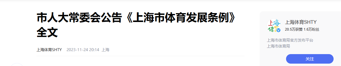 《上海市体育发展条例》已由上海市第十六届人民代表大会常务委员会第八次会议于2023年11月22日通过,现予公布,自2024年1月1日起施行。