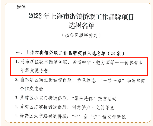 2023年,市侨联开展了上海市街镇侨联工作品牌项目选树活动,突显出一批有独创性和明显特色具有示范引领作用的工作品牌项目。 花木街道“亲情中华·魅力国学—— 侨界青少年华文夏令营”项目入选!