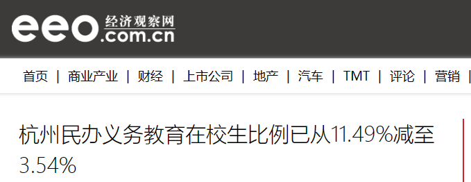 | 杭州民办义务教育在校生比例已从11.49%减至3.54% |