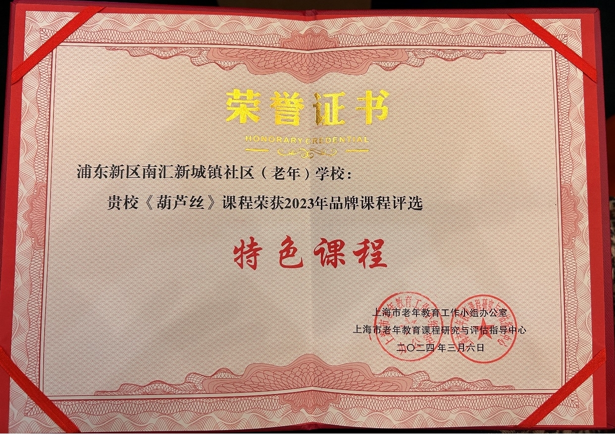 经专家评审,浦东新区南汇新城镇社教部选送的《葫芦丝》课程荣获2023年上海市老年教育品牌课程评选——特色课程。