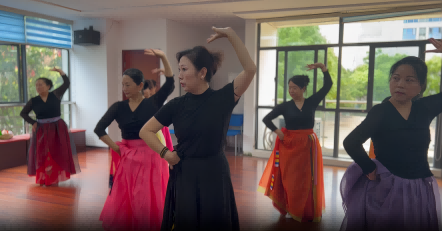 金惠淑老师的《卖花姑娘》朝鲜舞课,以其独特的民族风情,让学员们体验到异域文化的魅力。金老师以其精湛的舞蹈技艺,细致地传授着朝鲜舞的每一个基本动作,从指尖的轻盈旋转到足尖的细腻点踏,每个动作都蕴含着朝鲜舞蹈独有的韵味与故事。