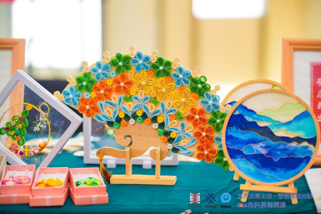 在本次活动中,浦东文化馆首次探索“文化+公益”新模式,联合浦东新区残疾人劳动服务中心,创新尝试非遗艺术与助残增收相融合,开启在市民艺术展演的“带货”义卖首秀。展位上,摆放的是来自残疾人学员亲手制作的衍纸系列饰品、五彩香包、绒花发簪、剪纸等,这些公益产品义卖所得善款,将继续用于支持残疾学员的日常生活和学习需求。