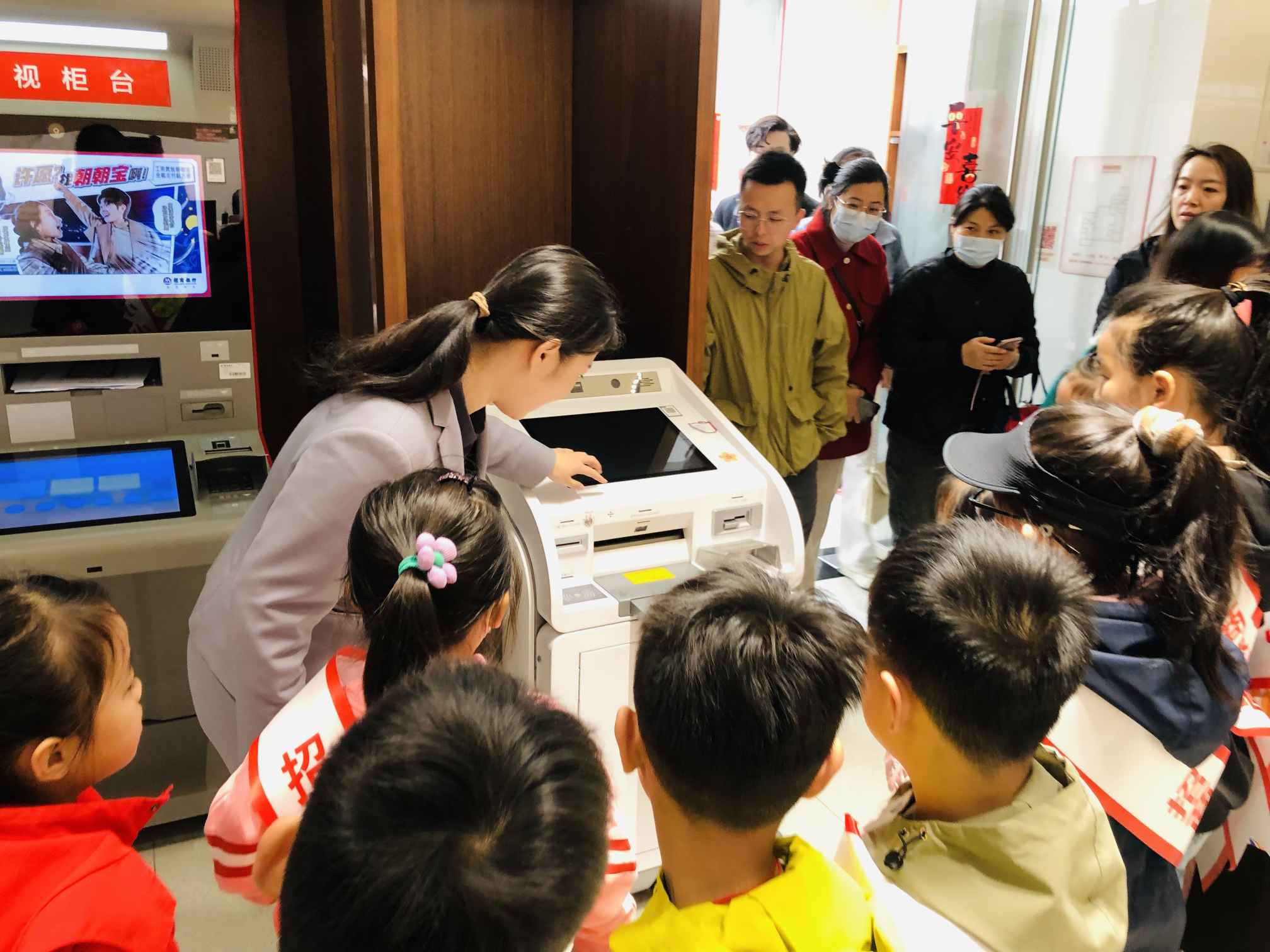 活动伊始,小朋友们在绶带授予仪式中正式化身“小小银行家”,开启了奇妙的金融体验之旅。工作人员带领他们实地参观取号机、智能柜台等银行设施,了解业务办理流程,体验银行工作场景。