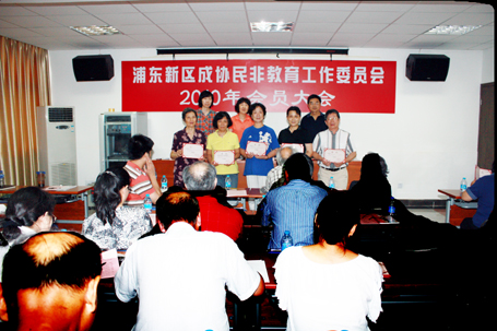(本站发表日期 2010-09-29) 9月20日,浦东新区成教协会民非教育工作委员会召开会员大会。民非教育81家会员单位中,共75家单位出席了大会。 大会由民非教育工作委员会秘书长刘红主持。首先,由工作委员会主任沈兆祥向大会汇报了2009至2010年工作委员会的六项工作,他说,这些工作的顺利开展并取得了一定成绩,主要有三个原因:其一是区成协的领导和关心;其二有工作委员会和各学科组组长等一批骨干单位的带头表率作用;其三更重要的是广大会员单位的大力支持和积极参与。他还提出了下阶段的三项工作,其中特别提到要求各会员单位积极参与今年“全民终身学习活动周”的活动。 接着,申报“上海市2006——2010年成人教育先进集体”的上海市张江信息技术专修学院和申报“先进工作者”的上海市广博进修学院谢育院长介绍了他们的先进事迹。区成协副秘书长孙洁汇报了浦东新区“时代杯”征文活动的开展情况。随后,区成协三位领导向荣获“时代杯”的三名二等奖和十名三等奖的代表颁发了奖状。