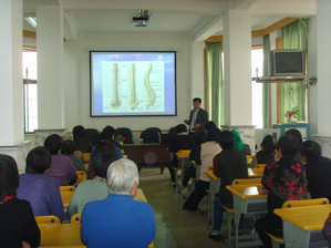 11月20日下午,唐镇唐人苑居委在居委市民学校里进行“腰椎退行性病变”讲座。 公利医院骨科主任杨铁毅介绍了腰椎病的症状,治疗的方法,自我健身疗法等,并用投影显示:“正常脊柱解部形态”和“腰椎退化性下腰椎椎管形态演变”作比较。图文结合,让居民边看图边听讲解。听课的62名中,老年居民(都是离土农民)都有不同程度的腰痛,听了杨主任的讲座,使大家知道了自己的毛病,学会自我健身疗法,中药、西药治疗腰椎病的药方。杨主任还耐心地听取患腰椎病居民的病情,都一一作了解答。