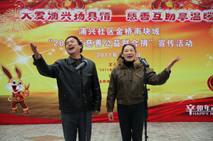 连日来,浦兴社区开展帮困送温暖募捐活动,消息传到荷五小区刘亚芳特困离异家庭,她知道后立刻赶到现场捐上50元钱,表达自己回报社会的一点心意。胶一小区外来媳妇刘影也闻讯赶到现场,把做钟点工挣来的100元钱投入了捐款箱。金桥公园门口一字排开设摊义卖更是热火朝天,13个居委近千名居民纷纷拿出家中多余的日用品、玩具、拎包、手机、家用电器等许多物品进行义卖,不到一个小时志愿者冒着寒风把义卖物品买得一干二净,义卖款达近二千元。13个居民区书记、主任、居委干部、还有社区居民和游客现场来募捐,募捐款达二千多元。据悉。将把义卖、捐款所得上交给街道帮困基金会,帮助社区更多困难的家庭过一个快乐的春节。 金桥湾居委合唱队和金桥居委文化志愿者还表演了合唱《母亲船》、《没有共产党就没有新中国》,舞蹈《草原之歌》、上海说唱《党的温暖暖人心》等丰富多采的文艺节目,为2011年浦兴社区慈善公益联合捐宣传活动,奉献了文化志愿者一份真情。爱,还在浦兴社区生生不息的传递着……