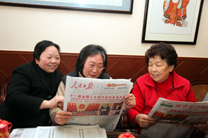 3月7日,茶馆里的常客们正在阅读《新华每日电讯》上刊载的两会新闻。全国两会开幕以来,东明路街道老年人活动室——“阿婆茶馆”特别开设了“两会议事堂”,社区内的30多位老人每天下午集体研读报纸,关注两会动态,讨论民生等热点话题。 由东明路街道居民自发成立的“阿婆茶室”、花迷俱乐部、“粽子球”运动等多个自助自理性群众组织和文化团队,不仅为东明路街道社区营造了尊老敬老、相互关爱的新风尚,还为居民区党支部在核心引领、民主决策等基层党内民主平台与路径的有益探索起到保障作用。 如红枫苑小区“阿婆茶室”每周一到周六上午向社区内的老年人开放,每天都有一个主题活动。而周一的小区“议事厅” 更有特色,成为关心党和国家大事、传播精神文明的场所和小区的新闻中心。老人在“阿婆茶室”里喝茶聊天、畅谈国事,对小区里发生的大事共同关心、共同商量、协调处理。全国“两会”期间,茶室老人“议两会,说心声”,读报看报一片和谐景象。