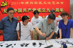 纪念建党九十周年,书画创作寄深情。 6月11日,由浦兴社区(街道)党工委、办事处主办,浦兴社区文化中心承办,中国书法艺术家协会上海分会、浦兴社区老年书画社协办的2011年浦兴社区文化艺术节,纪念中国共产党成立九十周年“永远跟党走”书画联展,在浦兴社区文化大厅举行。来自浦江两岸书法家和书画爱好者近百人参加,有140余幅书画作品参展。 140余幅栩栩如生的书画挂在展板上,一展书法家,书画爱好者的文化艺术风采,吸引了许多居民驻足观看,对创作艺术精品是啧啧称赞。浦江两岸书画爱好者在书画展互相交流创作心得、切磋书画技艺,是这次书画联展上一大亮点。 在书画联展上,中国书法艺术家协会,上海分会会长刘景新饶有兴趣地泼墨挥毫以书画形式,抒发对党的热爱、对和谐家园的赞美。靓起一道独特的文化风景线! 据悉,“庆七·一永远跟党走”书画联展,展出一天,有近600人踊跃前来观看。