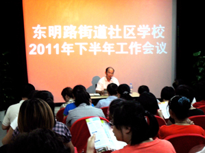 7月12日下午,东明路街道社区学校在街道科普基地剧场召开2011年下半年工作会议,37个居委学习站点教务负责人出席会议。 会上,社区学校常务副校长李锦耀对上半年工作做了总结,并对下半年的招生工作、信息工作、终身学习周活动、居委学习站点工作、社区教育实验项目等工作做了具体的部署。会上还下发了东明路街道《关于组织开展“2011年上海社区网上读书活动”的通知》,最后通报了今年11月东明路街道还将继续主办上海市第十五届全民健身节“东明杯”粽子球比赛,使社区教育实验项目的成果不断延伸发展,他希望各居委学习站点粽子球队加强培训,使成绩更上一层楼。