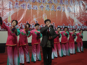 12月26日是高桥镇老年学校唱歌班10岁“生日”,88位学员都穿上表演的彩装,借助高桥镇老年志愿者工作总结表彰会机会,举办“十周年庆典红歌会。