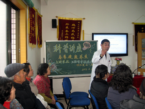 2月22日上午,上海申诚医院高院长率各科专家医师一行8人来到金杨四街坊,为灵山一居学习站点开设科普讲座,宣讲春季中老年健康养生知识,受到居委书记徐林妹和30余位居民的欢迎。 高院长等专家以《春季日常饮食、生活规律》为主题,结合多媒体PPT课件详细解说了日常生活中的各种病例,告诉中老年居民如何预防春季高发的常见病,如何养生长寿的药理常识等。申诚医院各科的主任医师还在现场为患者作义诊、咨询,有听诊的、有按摩颈椎的、有的发放健康宣传资料,寓教于乐的形式让居民们受益匪浅。