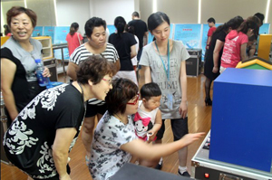 由环球健康与教育基金会、上海科普教育发展基金会、高通中国、上钢新村街道暑期办联合举办的家门口的“流动科技馆”——社区科普体验活动上钢新村街道专场第一场于7月21日下午在上钢新村街道社区学校举行。来自上钢一村、上南花城等11个居委的青少年和居民共268人参加了这次活动。 活动有二个内容,一是科普仪器的体验,参观者通过亲手操作科普仪器,了解声、光、电等科学知识。二是学科知识问答。参观者通过回答主办方准备的题目,可以了解到拓扑学、生肖等知识。精巧的仪器,有趣的问题,让参观者流连忘返,部分小朋友整整一下午,穿梭在各个展台间,“研究”着、观察着,汲取着知识的营养,乐此不疲。带队的青保干部和文教干部,也拿着题目,奔波在题海中。